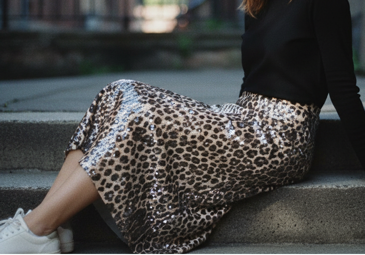 Paired mine with a black sweater and sneakers for a coffee run. The leopard print adds just enough edge without trying too hard. So comfortable I forgot I was wearing sequins.